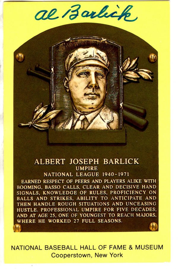 Here is an UNIQUE item for baseball fans and collectors! It’s a Hall of Fame issued Post card plaque that measures 3 1/2″ x 5 1/2 ” featuring Hall of Fame member, Al Barlickand it’s AUTOGRAPHED! It’s signed in SHARPIE.