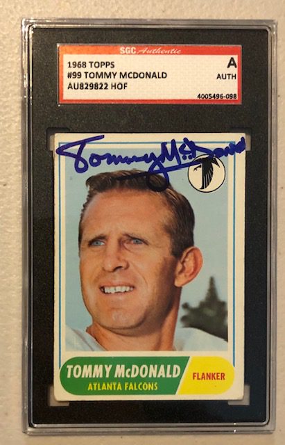 Autographed 1968 Topps Tommy McDonald Atlanta Falcons card #99 SGC Slabbed . Signed in blue sharpie.
