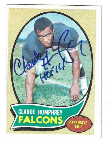 Autographed 1970 Claude Humphrey Atlanta Falcons Rookie Card #156 . Signed in blue sharpie.