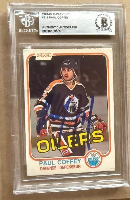 Autographed 1981-82 O-Pee-Chee Paul Coffey Oilers Rookie Card #111 Beckett Slabbed. Signed in sharpie.