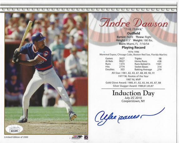 Autographed 8X10 HOF Induction photo card of Baseball Hall of Famer ANDRE DAWSON of the Chicago Cubs. JSA Witness COA