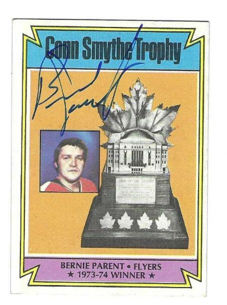 Autographed Bernie Parent 1974-75 Philadelphia Flyers card #251 . Signed in blue sharpie.