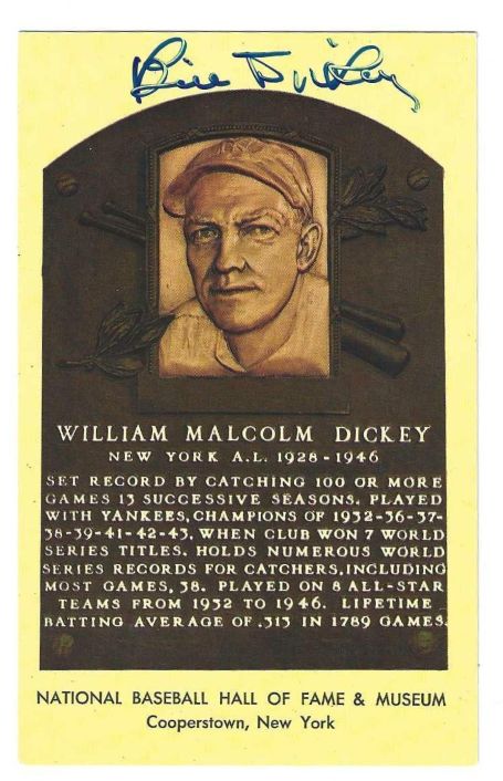 Here is an UNIQUE item for baseball fans and collectors! It’s a Hall of Fame issued Post card plaque that measures 3 1/2″ x 5 1/2 ” featuring Hall of Fame member BILL DICKEY AND IT’S AUTOGRAPHED!