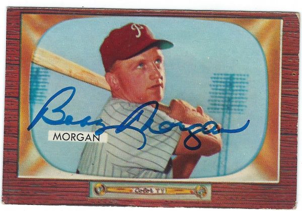Autographed BOBBY MORGAN 1955 Bowman card, #81 . Signed in blue sharpie.