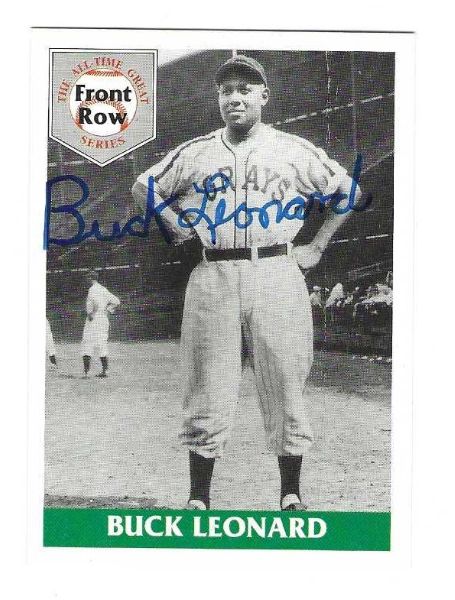 Autographed BUCK LEONARD 1992 Front Row Card #2. Signed in blue ball point.