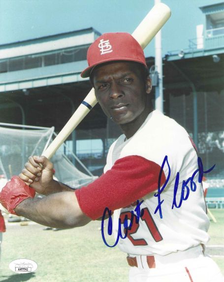 Here is an AWESOME item for Cardinals baseball fans and collectors! It’s a color 8″ x 10″ glossy photo of signed CURT FLOOD AND IT’S AUTOGRAPHED! It’s signed in sharpie and is GORGEOUS! JSA COA.