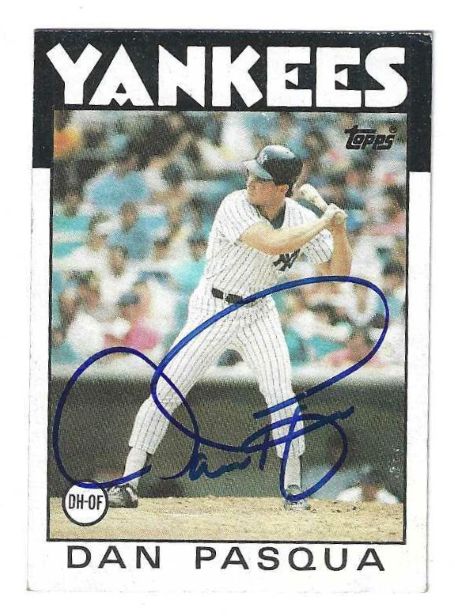 Autographed DAN PASQUA 1986 Topps card #259. Card is signed in blue sharpie.