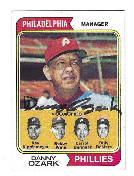 / Autographed DANNY OZARK Philadelphia Phillies 1974 Topps Card