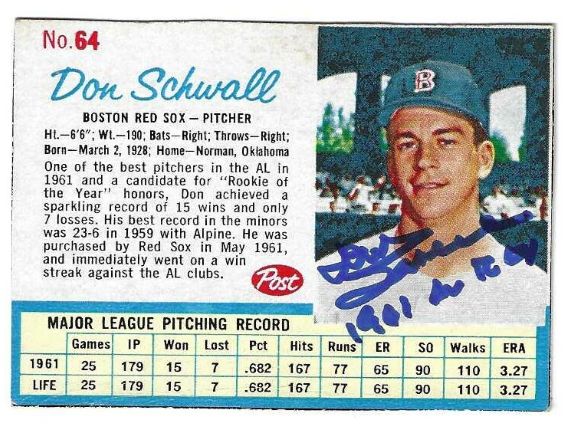 / Autographed DON SCHWALL Boston Red Sox 1962 Post Cereal Card