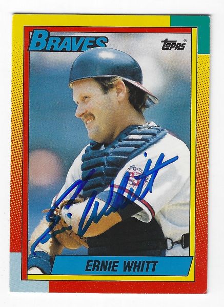 Autographed ERNIE WHITT 1990 Topps Card #128T. Signed in blue sharpie.