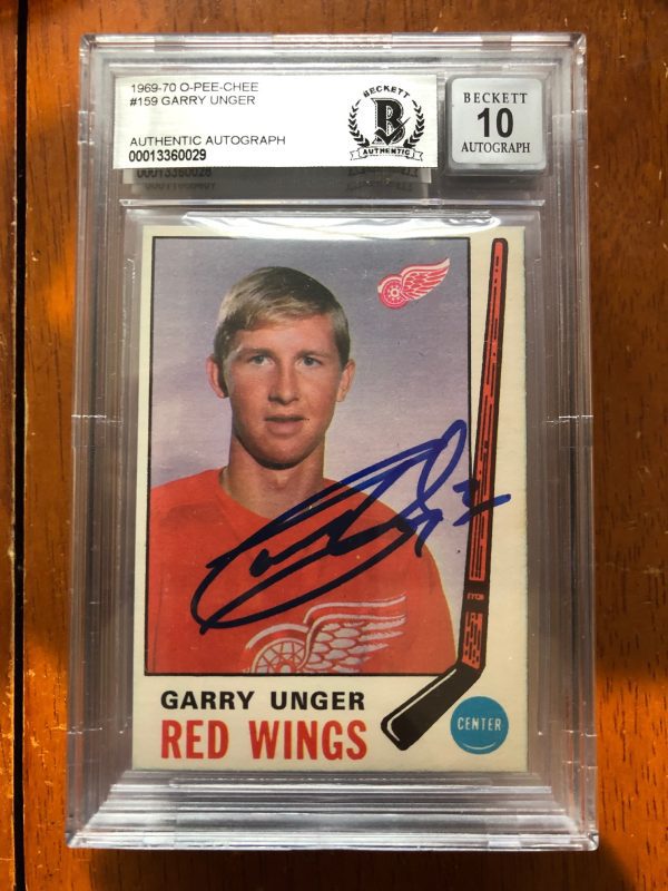 Autographed Garry Unger 1969-70 O-Pee-Chee Red Wings Card #159 Beckett Slabbed. Autograph graded a 10