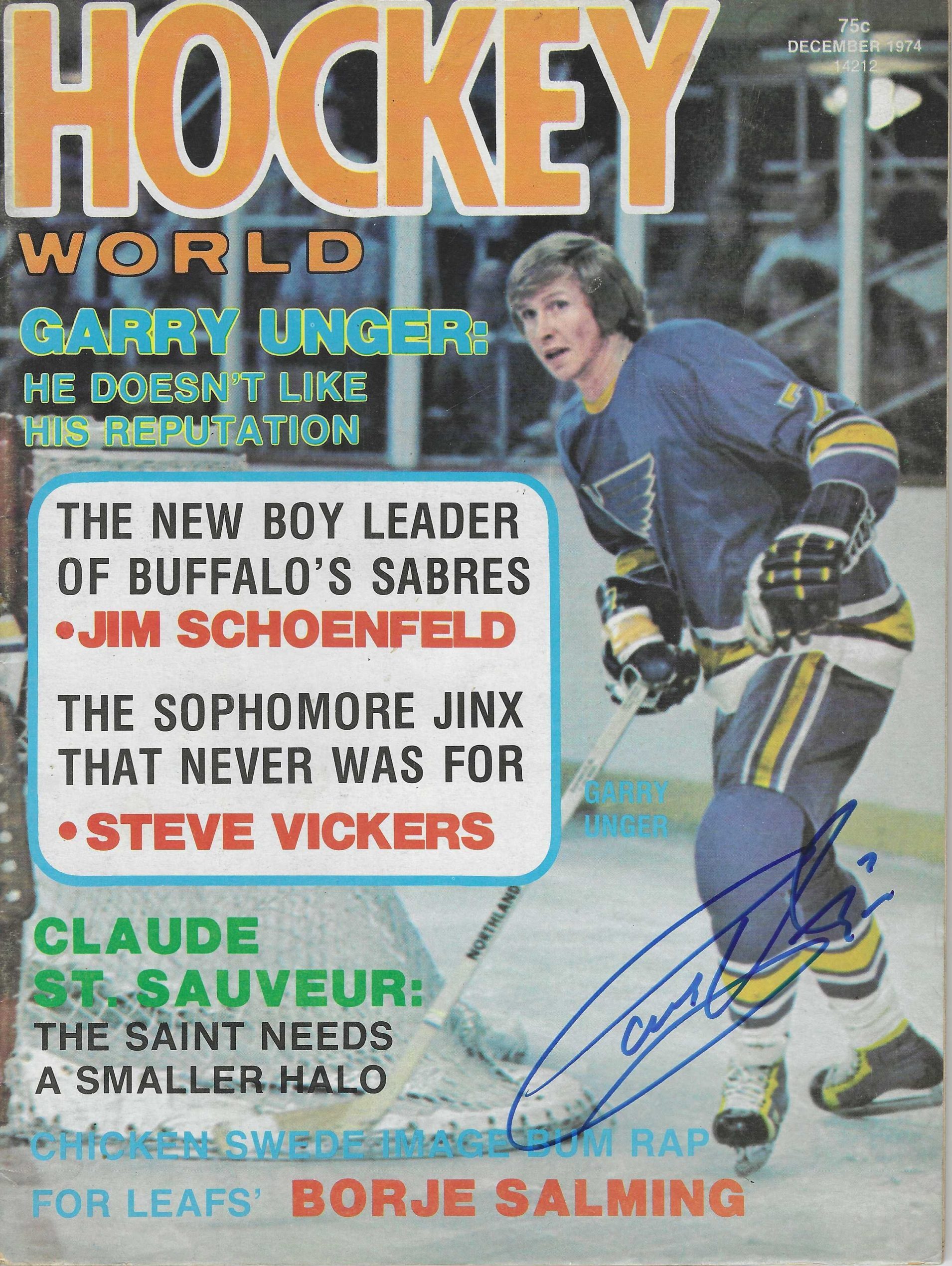 Autographed Garry Unger St. Louis Blues Hockey World Magazine December 1974. Signed in blue sharpie.