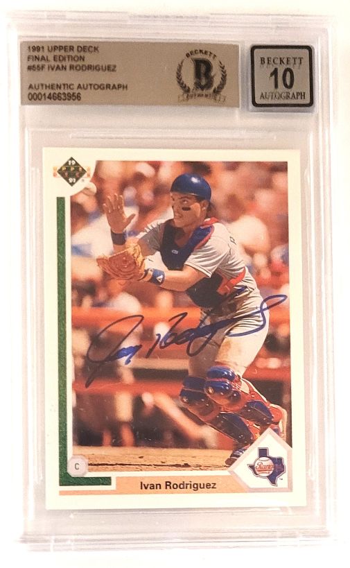 Autographed IVAN RODRIGUEZ 1991 Upper Deck Rookie Card #55F. BAS Beckett Slabbed