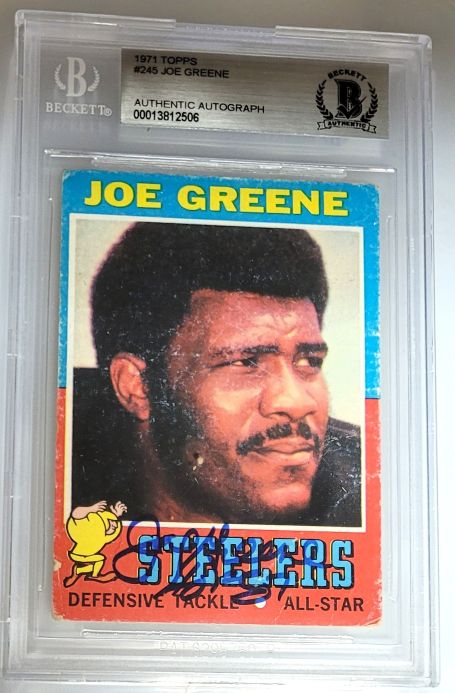 Autographed JOE GREENE Pittsburgh Steelers 1971 Topps Rookie card #245 BAS Beckett Slabbed.  Signed in blue sharpie.