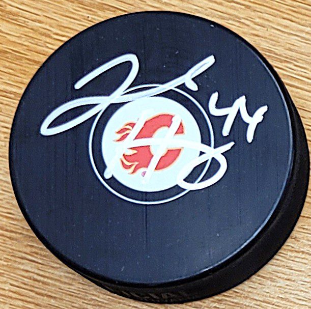 Autographed JOEL HANLEY Calgary Flames Hockey Puck. Signed in Silver sharpie.