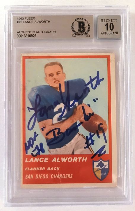 Autographed LANCE ALWORTH San Diego Chargers 1963 Fleer Rookie card #72 BAS BeckettĀ Slabbed. Autograph Graded a 10.