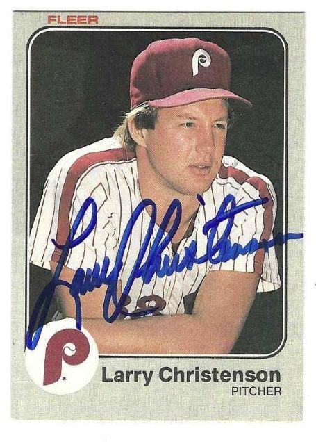 Autographed LARRY CHRISTENSON 1983 Fleer Card 6156. Signed in blue sharpie.