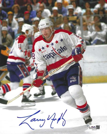 Autographed LARRY MURPHY 8×10 Washington Capitals photo. Signed in blue sharpie Member Hockey Hall of Fame.JSA COA.