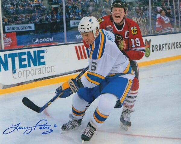 Autographed LARRY PATEY 8X10 St. Louis Blues Photo. Signed in blue sharpie.