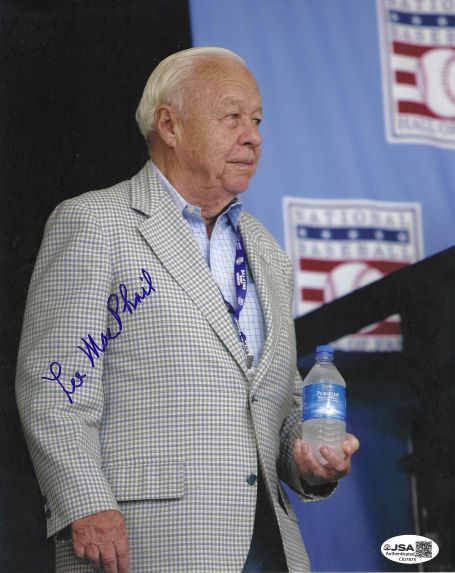 Autographed LEE MACPHAIL8X10 HOF Color photo.. Signed in blue sharpie. Mr. MacPhaill is a honored member of the Baseball Hall of Fame. JSA COA.