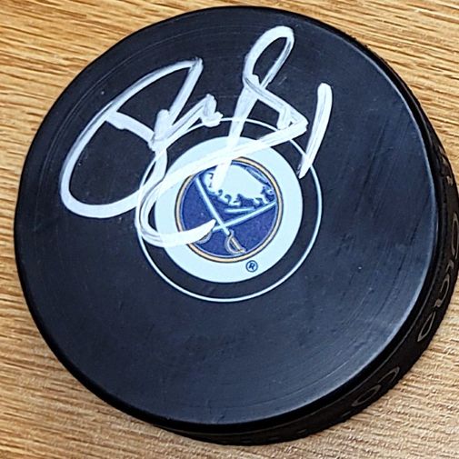 Autographed PHIL HOUSLEY Buffalo Sabres Hockey Puck. Signed in Silver sharpie.