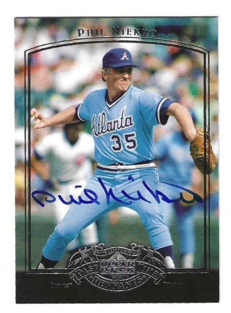 Autographed PHIL NIEKRO 2005 Upper Deck Past Time Pennants Card #64. Signed in blue sharpie.
