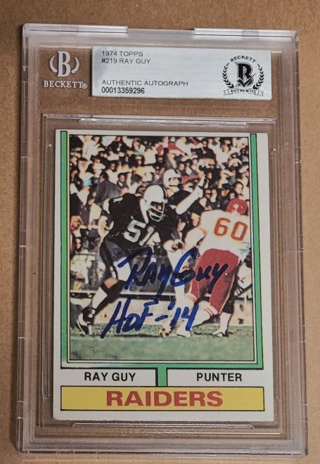 Autographed RAY GUY Raiders 1974 Topps Rookie Card #219 BAS Beckett Slabbed . Signed in sharpie.