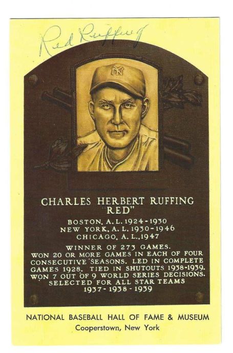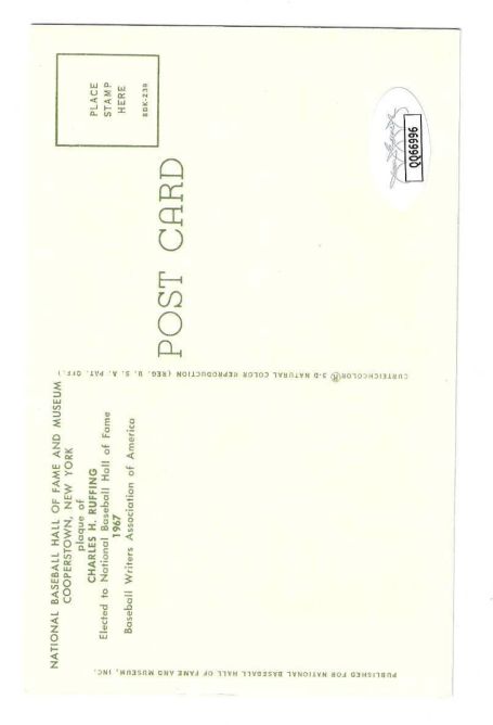 Here is an UNIQUE item for baseball fans and collectors! It’s a Hall of Fame issued Post card plaque that measures 3 1/2″ x 5 1/2 ” featuring Hall of Fame member, Red Ruffingand it’s AUTOGRAPHED! It’s signed in pen. JSA COA