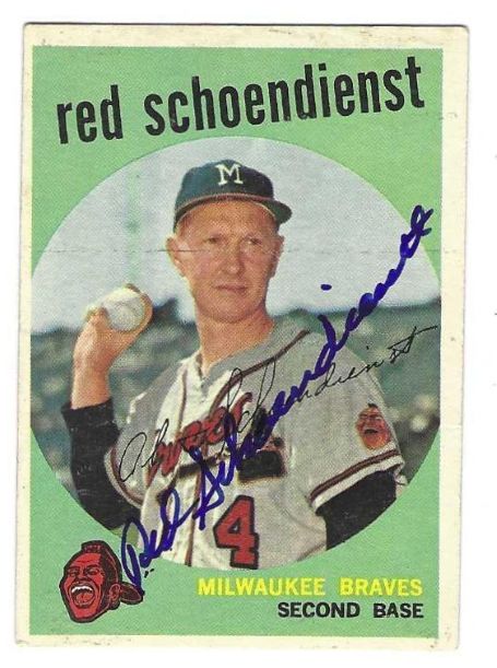 Autographed RED SCHOENDIENST Milwaukee Braves 1959 Topps Card. Condition of card is VG shape. Card #480. Signed in blue sharpie.