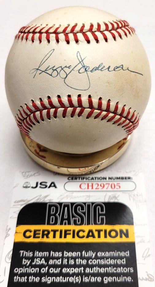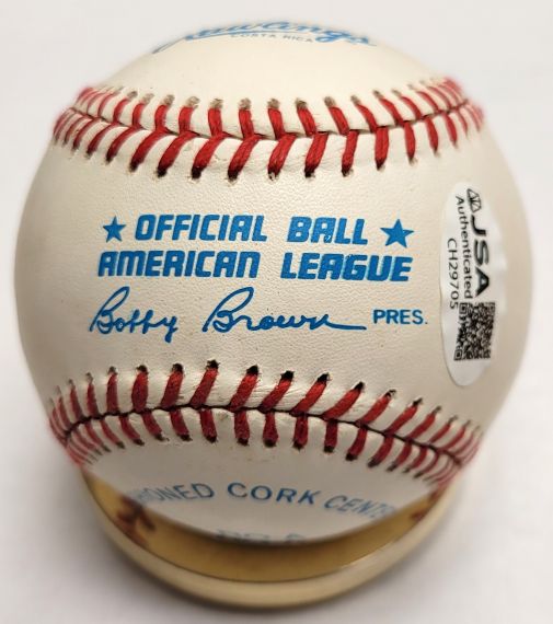 Official Rawlings American League Baseball autographed by Hall of Famer, REGGIE JACKSON. Ball is signed in blue ball point pen. JSA COA. Ball has toning and spotting.