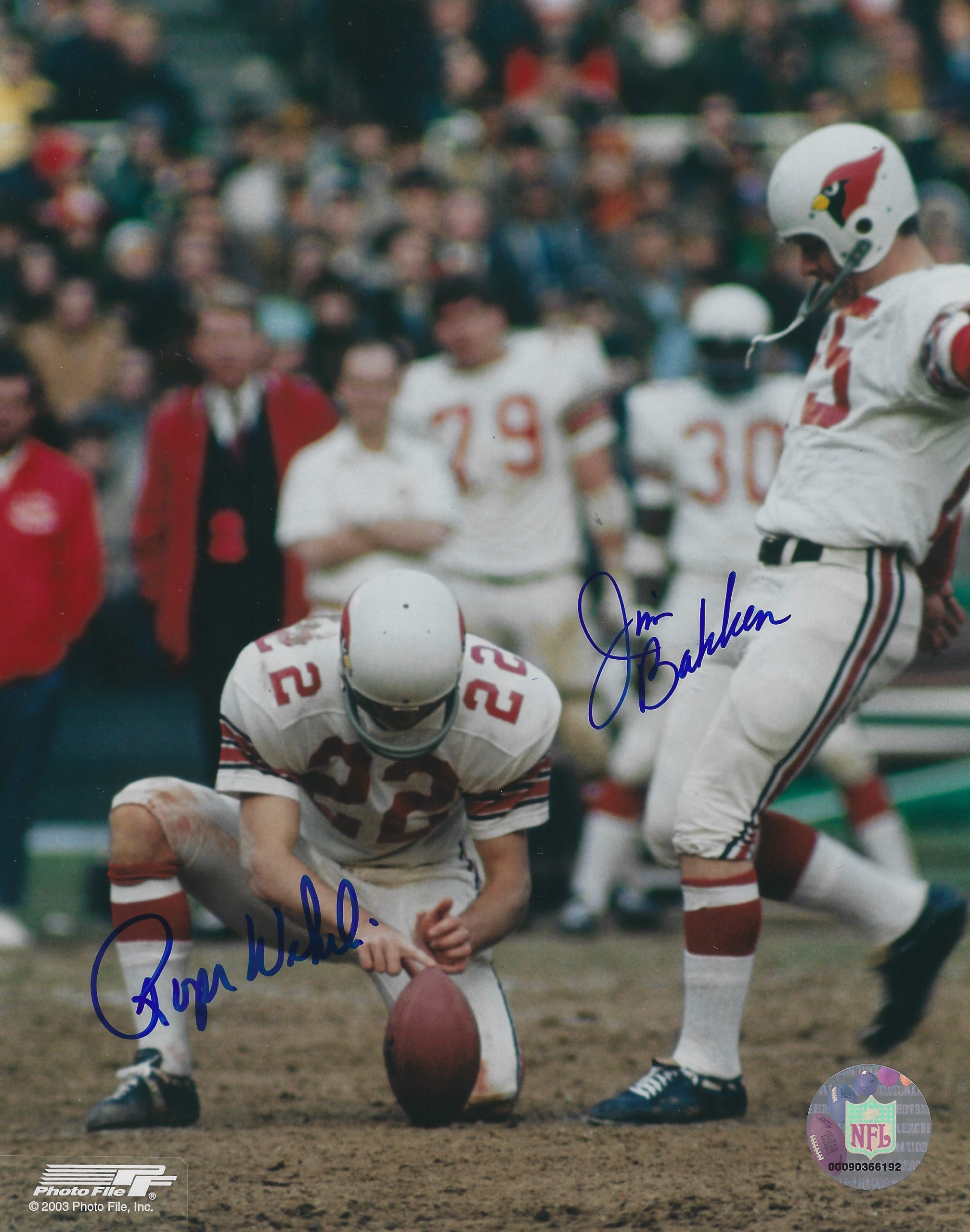 Autographed 8X10 photo of ROGER WEHRLI and JIM BAKKEN of the St. Louis Cardinals. Photo is signed in sharpie. Roger is a honored member of the Pro Football Hall of Fame.