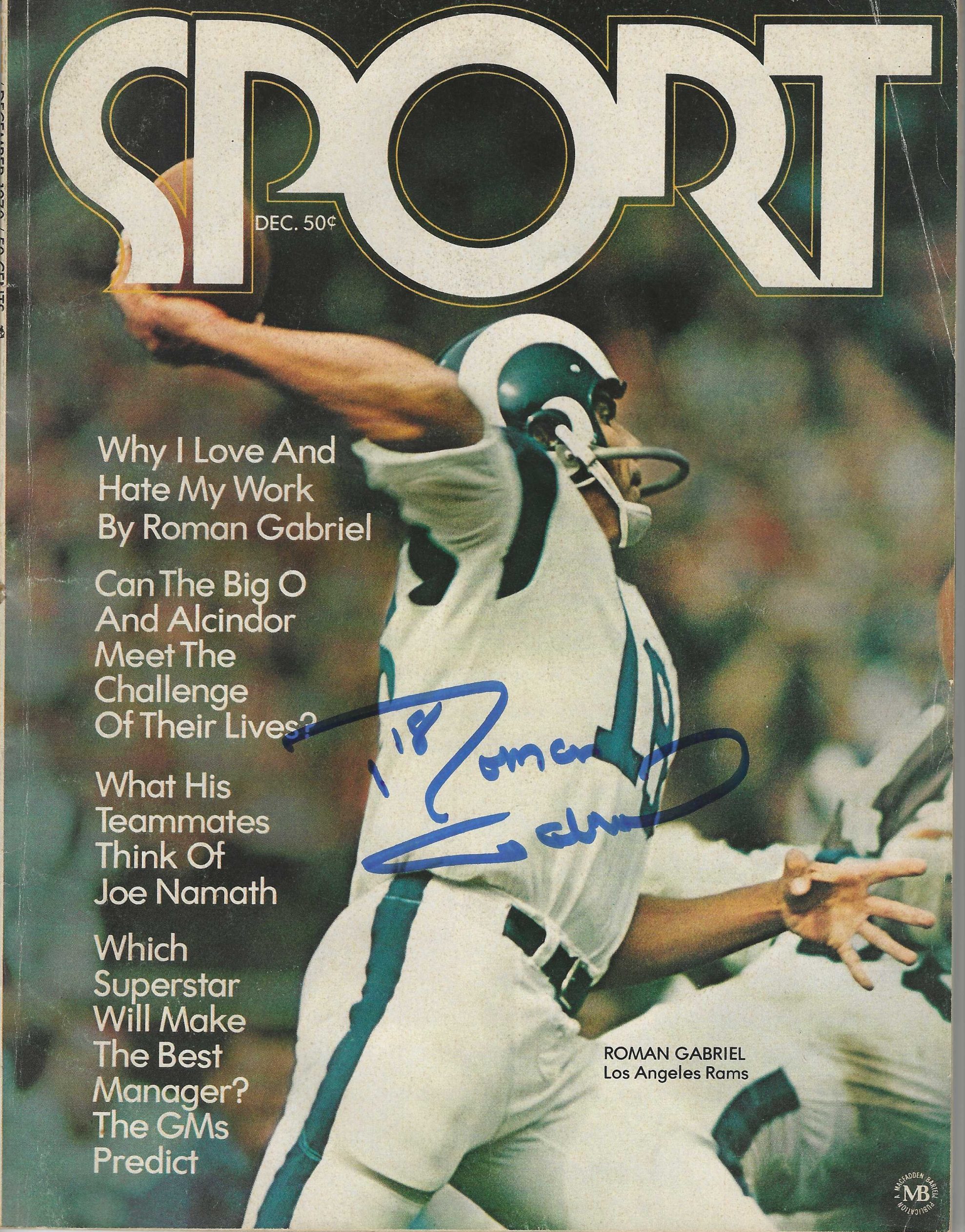 Autographed ROMAN GABRIEL Los Angeles Rams Sport Magazine December 1970 Signed in blue sharpie.