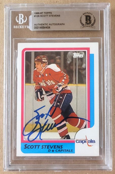 Autographed Scott Stevens Washington Capitals 1986-87 Topps card #126 BAS Beckett Slabbed . Signed in blue sharpie.