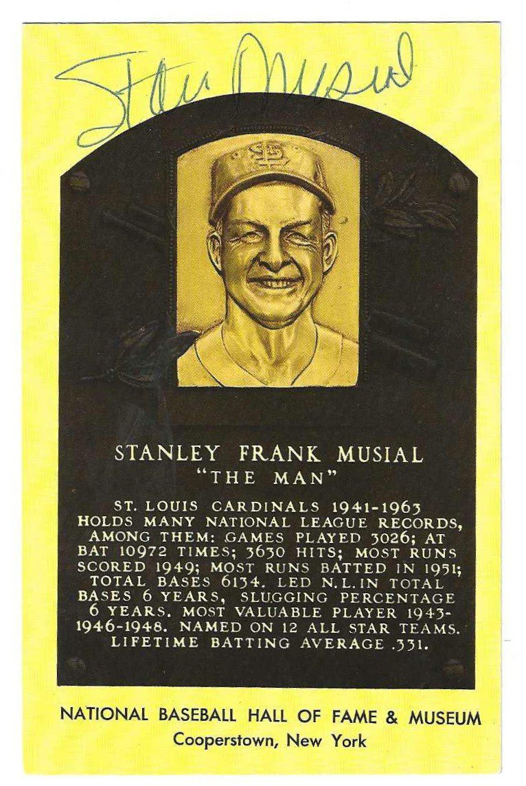 Here is an UNIQUE item for baseball fans and collectors! It’s a Hall of Fame issued Post card plaque that measures 3 1/2″ x 5 1/2 ” featuring Hall of Fame member STAN MUSIAL AND IT’S AUTOGRAPHED!