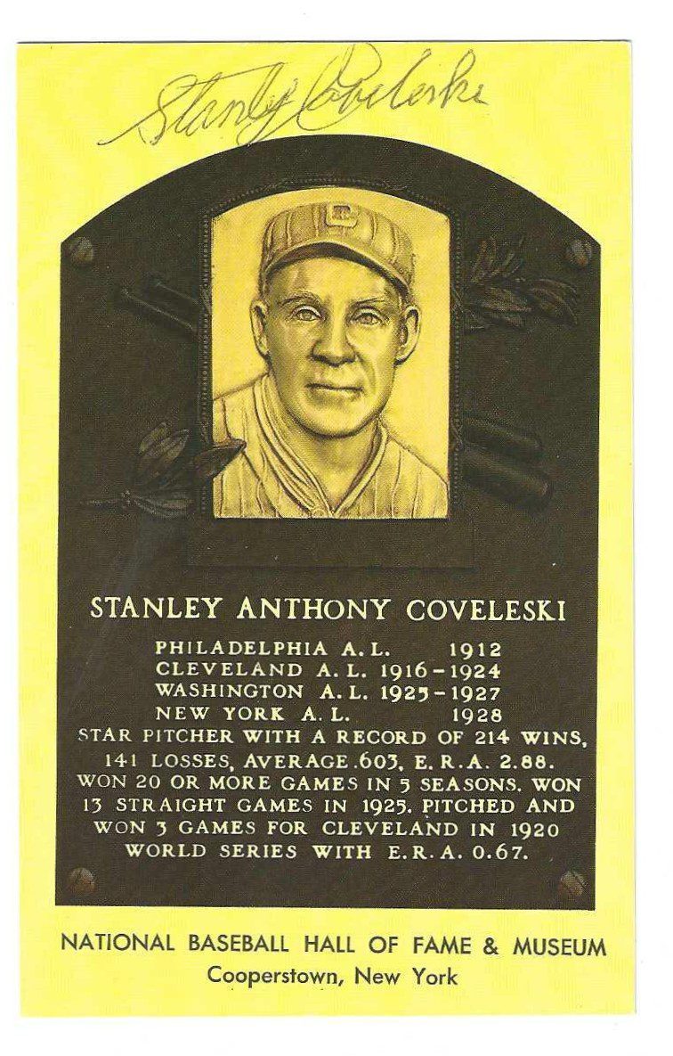 Here is an UNIQUE item for baseball fans and collectors! It’s a Hall of Fame issued Post card plaque that measures 3 1/2″ x 5 1/2 ” featuring Hall of Fame member, STANLEY COVELESKI and it’s AUTOGRAPHED! It’s signed in pen.
