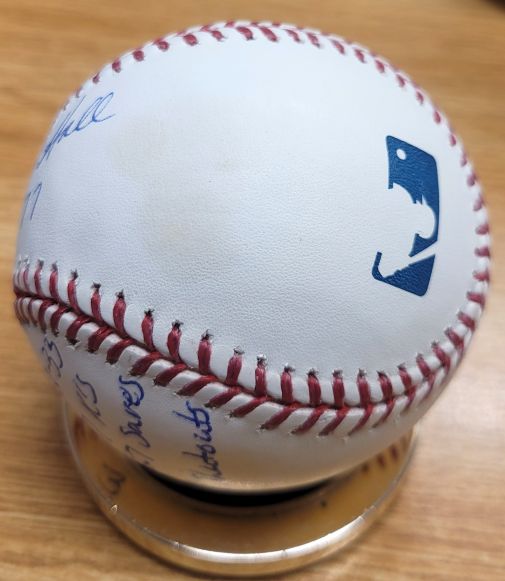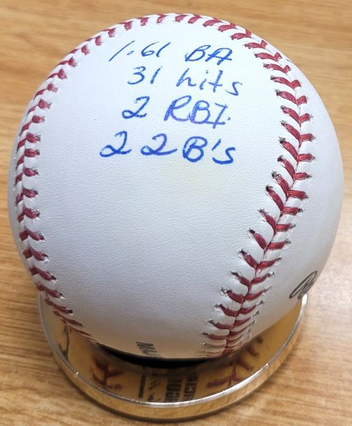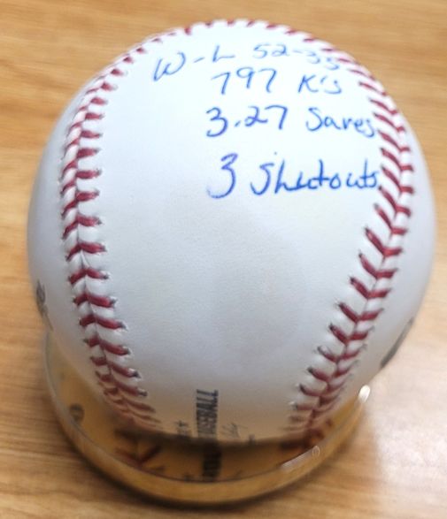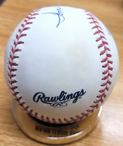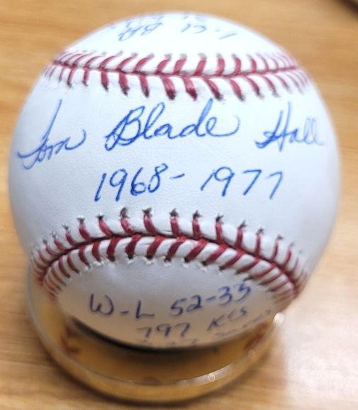 Official Rawlings Major League Baseball Stat Ball autographed by TOM HALL. Ball is signed in blue ball point pen. Ball has spotting.