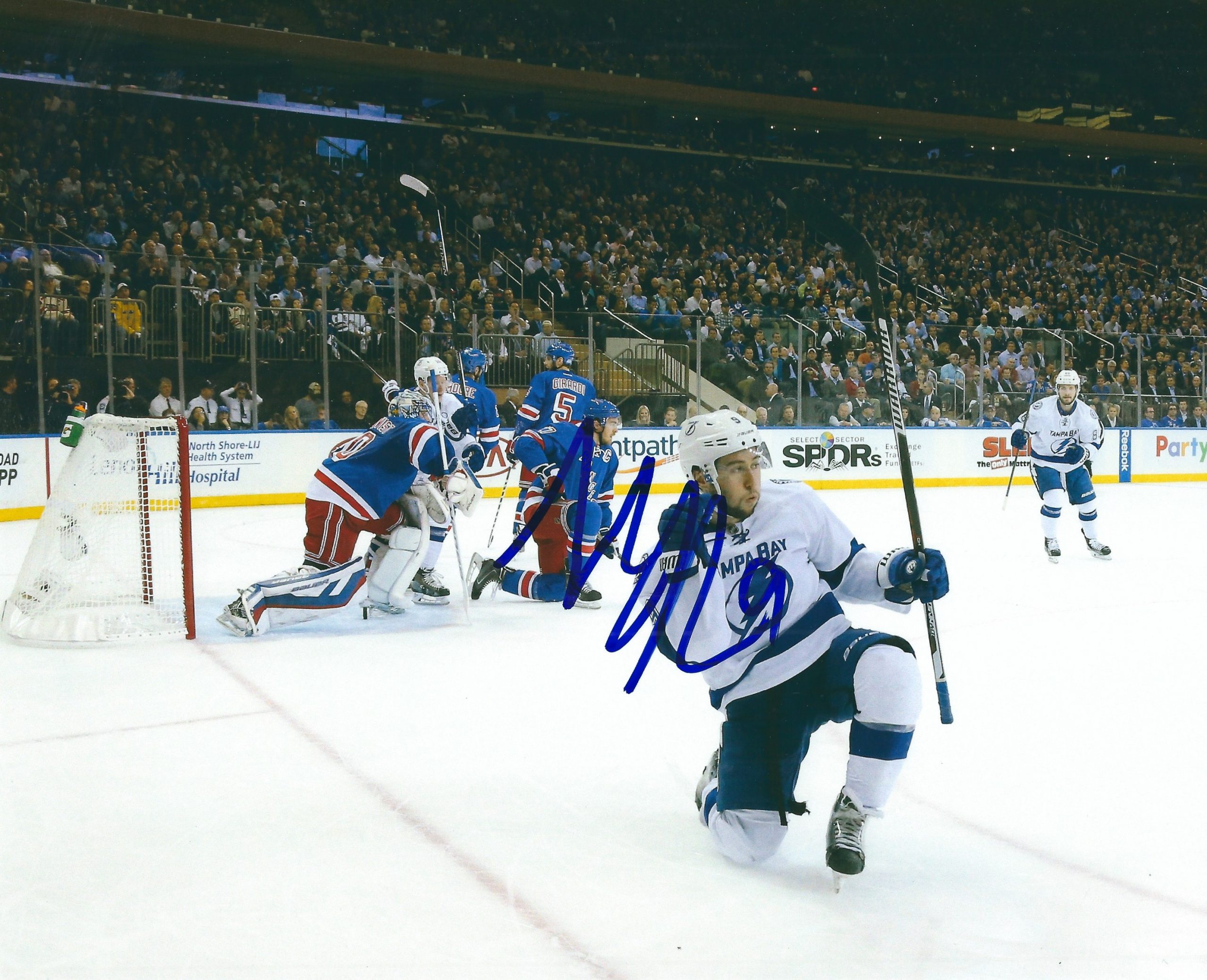 Autographed Tyler Johnson 8×10 Tampa Bay Lightning photo. Signed in blue sharpie.