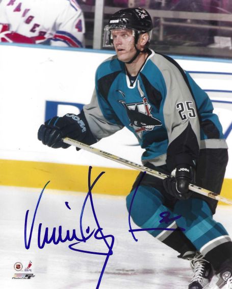 Autographed VINCENT DAMPHOUSSE 8X10 San Jose Sharks photo. Photo is signed in blue sharpie.