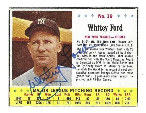 Autographed WHITEY FORDĀ 1963 Post Cereal Card #19. Signed in blue ball point.