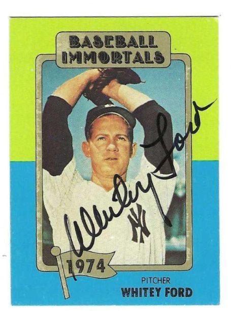 Autographed WHITEY FORDĀ 1980 Baseball Immortals Card #144. Signed in blue ball point.