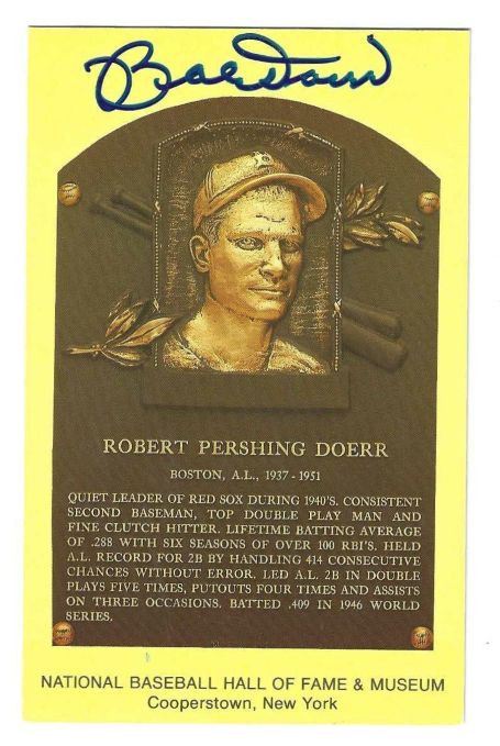 Here is an UNIQUE item for baseball fans and collectors! It’s a Hall of Fame issued Post card plaque that measures 3 1/2″ x 5 1/2 ” featuring Hall of Fame member, BOBBY DOERR and it’s AUTOGRAPHED! It’s signed in SHARPIE.