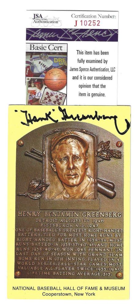Here is an UNIQUE item for baseball fans and collectors! It’s a Hall of Fame issued Post card plaque that measures 3 1/2″ x 5 1/2 ” featuring Hall of Fame member, HANK GREENBERG and it’s AUTOGRAPHED! It’s signed in sharpie. JSA Authenticated