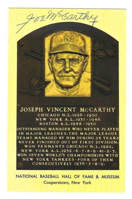 Here is an UNIQUE item for baseball fans and collectors! It’s a Hall of Fame issued Post card plaque that measures 3 1/2″ x 5 1/2 ” featuring Hall of Fame member JOE McCARTHY AND IT’S AUTOGRAPHED! It’s signed in PEN.