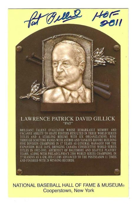 Here is an UNIQUE item for baseball fans and collectors! It’s a Hall of Fame issued Post card plaque that measures 3 1/2″ x 5 1/2 ” featuring Hall of Fame member, PAT GILLICK and it’s AUTOGRAPHED! It’s signed in SHARPIE.