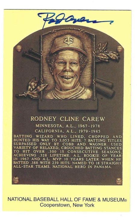 Here is an AWESOME item for baseball fans and collectors! It’s a Hall of Fame issued Post card plaque that measures 3 1/2″ x 5 1/2 ” featuring Hall of Fame member Rod Carew! AND IT’S AUTOGRAPHED! It’s signed in blue sharpie and is GORGEOUS! You won’t be disappointed. The item comes from Main Line Autographs.